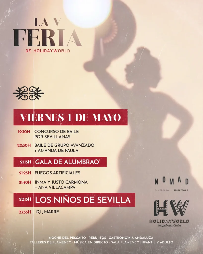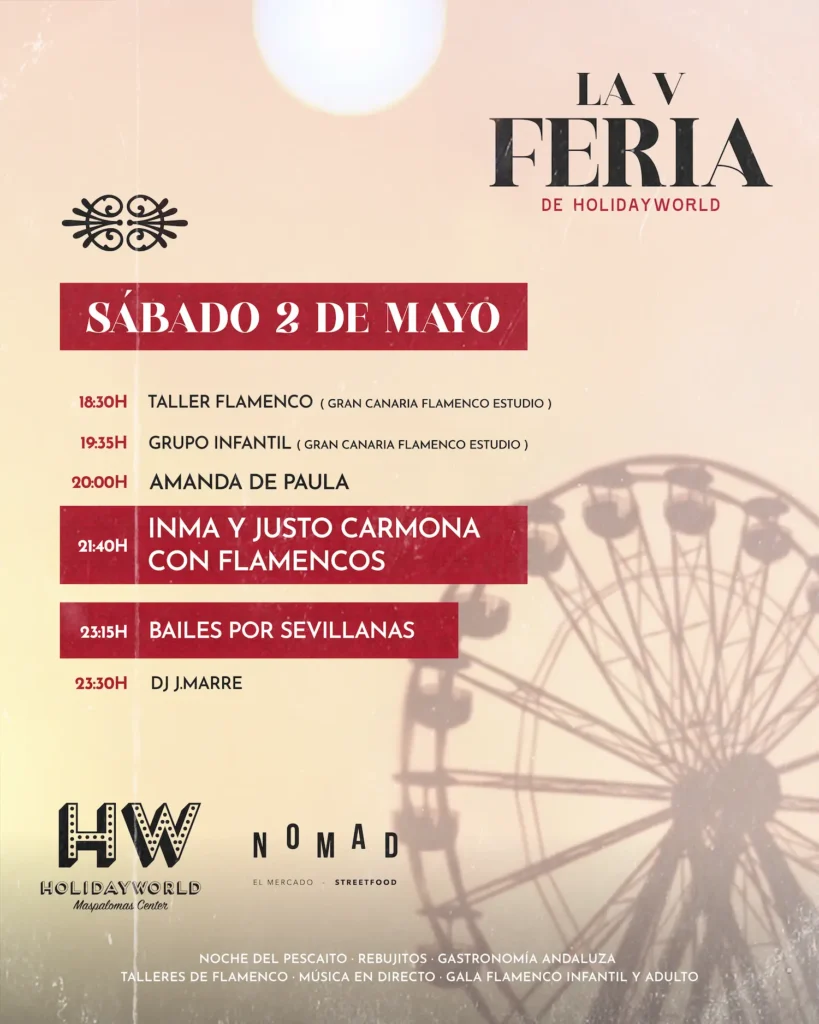 ¿Buscas un plan que combine tradición, sabor y diversión sin salir de Gran Canaria? Prepárate, porque los próximos 1 y 2 de mayo de 2026, Holidayworld Maspalomas se transforma para celebrar su esperada Feria de Abril. Olvida las maletas: este año, la esencia de Andalucía se traslada directamente a la terraza del Mercado del Nomad para ofrecerte dos días llenos de arte.
