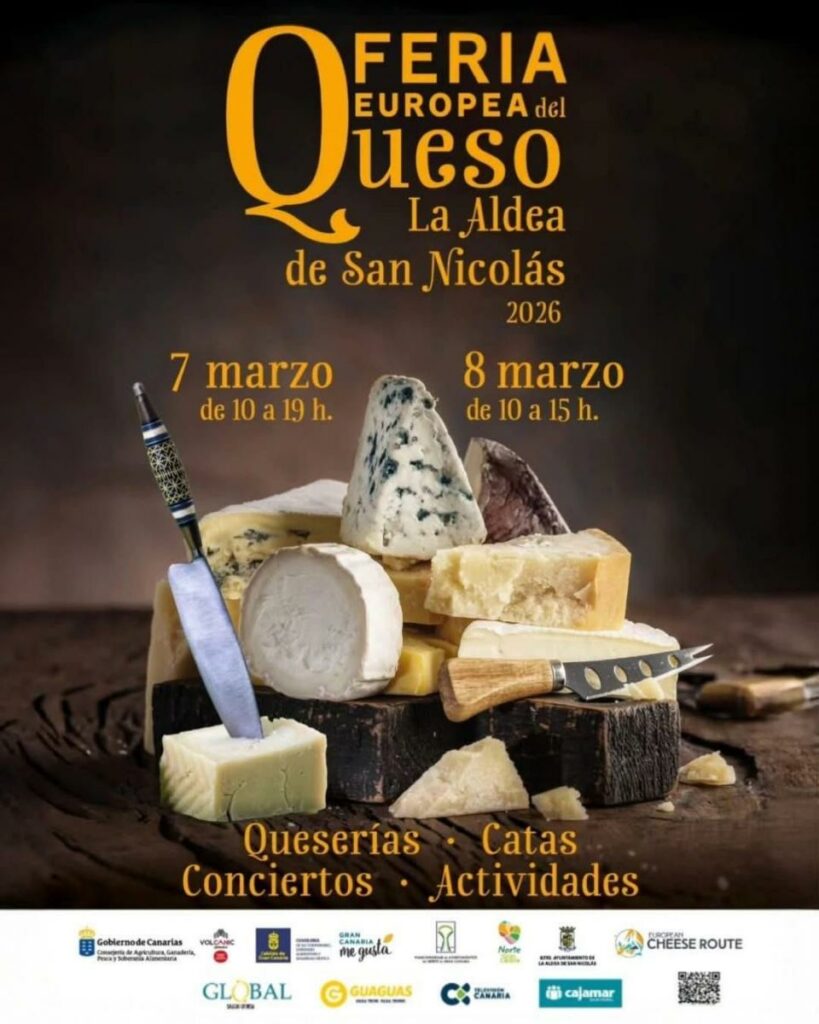 La Aldea de San Nicolás se viste de fiesta los dias 7 y 8 de marzo en Plaza Alameda con más de 30 queserías de Canarias, Baleares, Península y Portugal. Inauguración oficial (12h sábado),Podras disfrutar de catas gratuitas y talleres ganaderos con música y exposiciones. ¿Sabías que forma parte de la Ruta Europea del Queso? Un plan gastronómico accesible para grupos curiosos por lo artesanal.